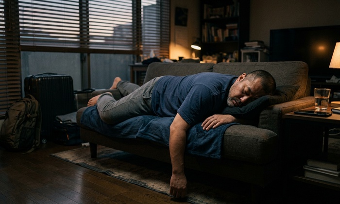 【電池切れ】ソファに倒れ込んだまま動けない男性。
