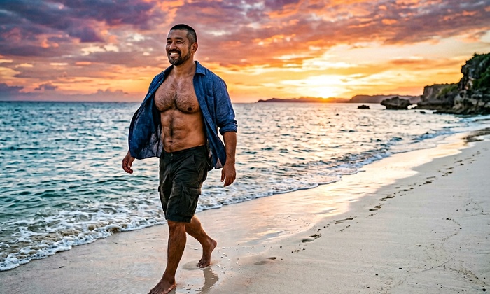 【再起動完了】夕暮れの沖縄ビーチを笑顔で歩く男性。