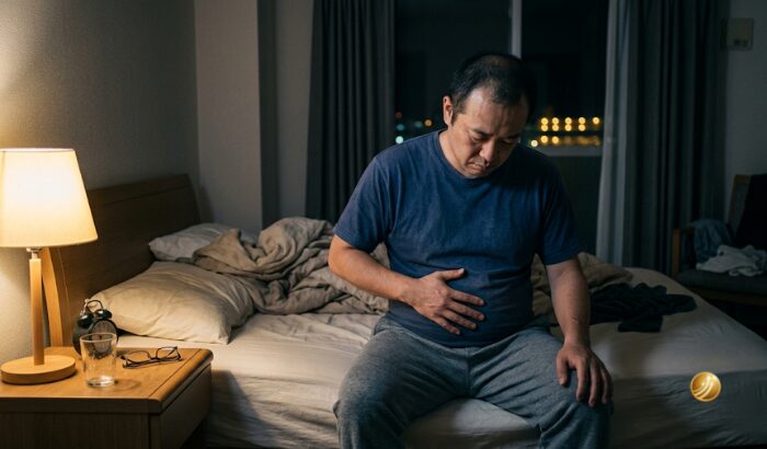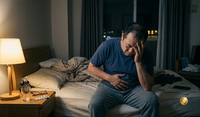 40代半ばの日本人男性が、ストレスと睡眠不足により、自律神経が乱れている様子を描写した