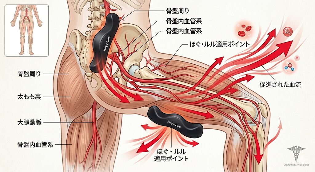 股関節周りの深層筋肉にアプローチし、滞っていた血流を劇的に改善させる様子。